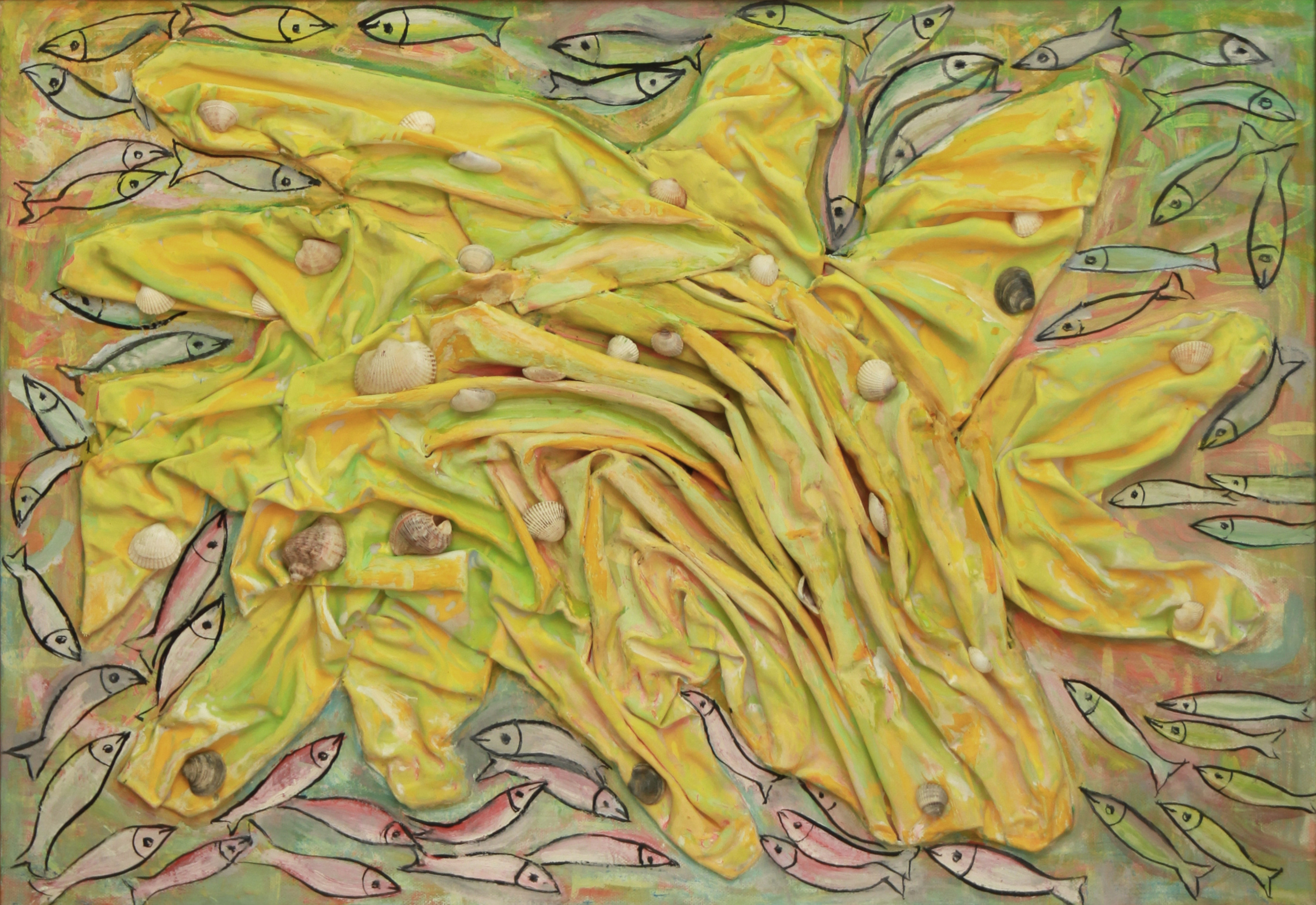 ![]() Пано-колаж в жълто с миди и рисувани риби - гваш 59х80 | ![]() Морско дъно – светло - гваш 54/70 |